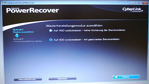 ACHTUNG! Die Option "Auf HDD zurücksetzen - mit gesicherten Benutzerdaten" ist nicht immer vorhanden! Hier am Besten den Kunden vorlesen lassen, welche Optionen angeboten werden.